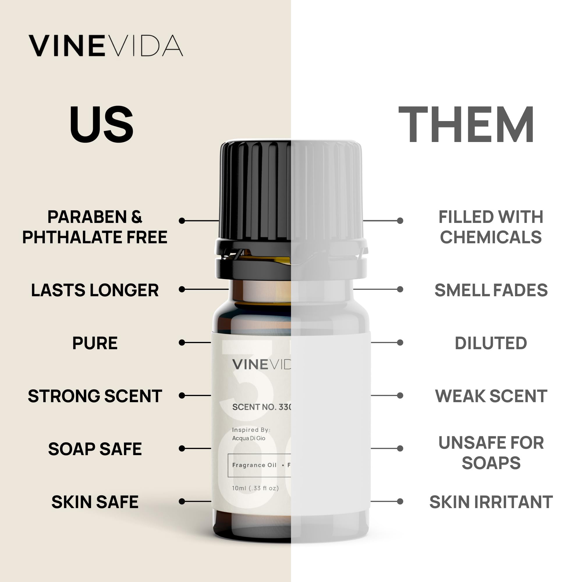NATURAL - Our scents and fragrances are skin-safe (when diluted) using pure, natural, and raw ingredients. All VINEVIDA products are vegan, free of phthalates, parabens, and other potentially dangerous chemicals.