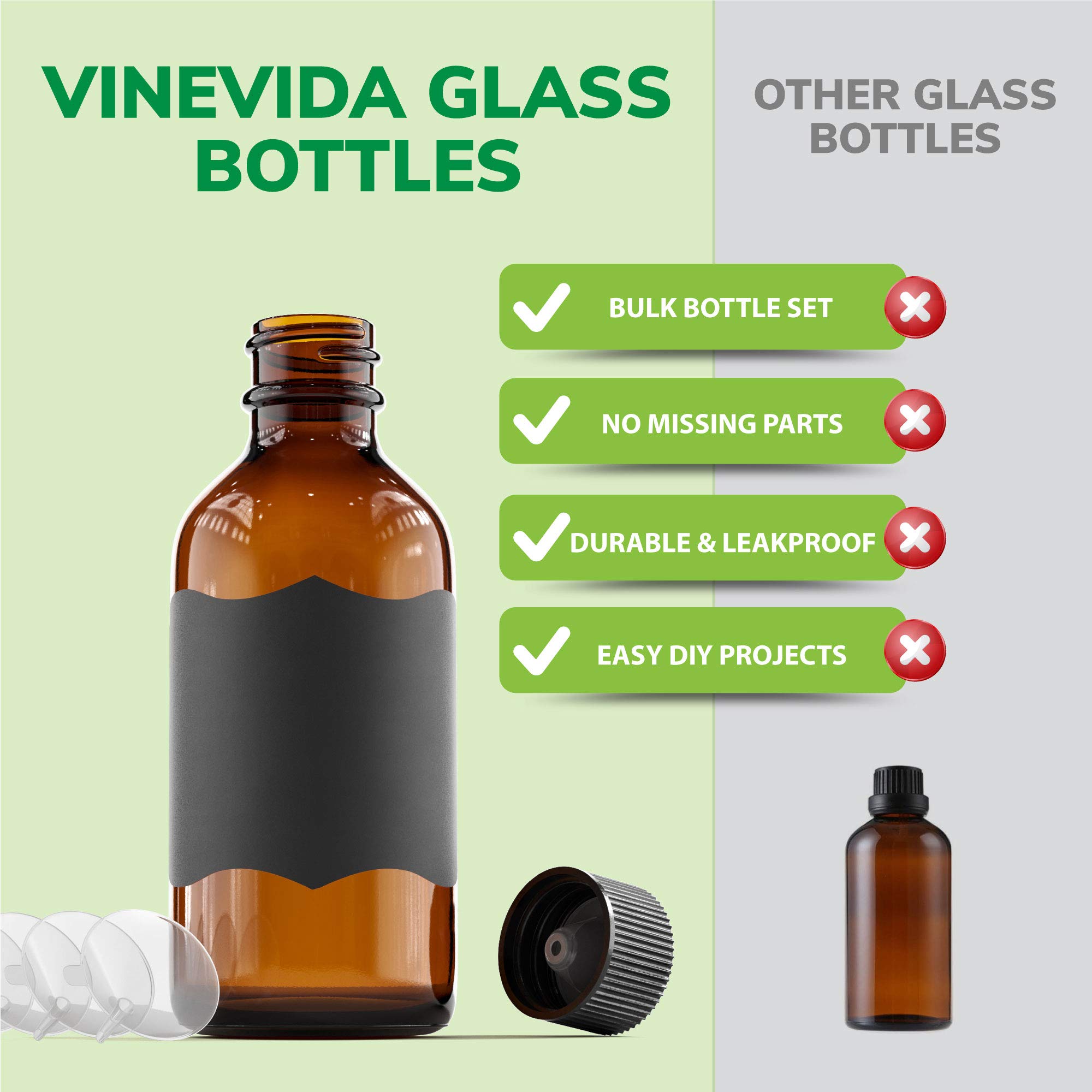 VINEVIDA 2 oz Amber Glass Bottles - 12 Pack Amber Boston Glass Bottles With Poly Cap and Accessories - Chalk Labels, Funnels - Empty Tincture Bottles for Essential Oils, Lab Chemicals, and Perfumes